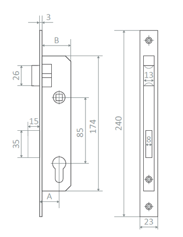 APECS NP75 is ideal for slimline aluminium profiles and can also be used on uPVC and timber doors when 85 PZ centres are required, but where multi-point locking is not possible and/or not needed.